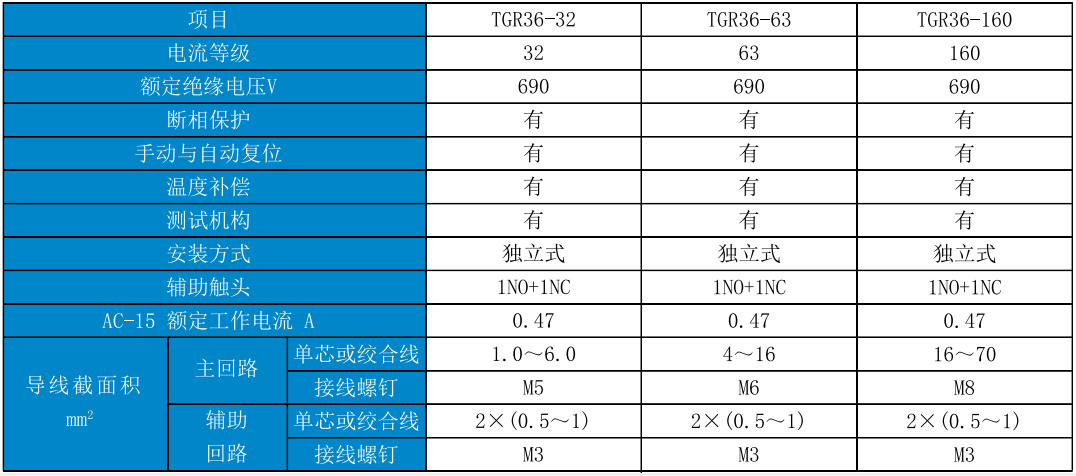 TGR36系列热过载继电器(以下简称继电器),适用于交流50Hz(或60Hz)、工作电压至690V及以下、电流至160A的长期工作或间断长期工作的交流电动机的过载保护和断相保护之用。